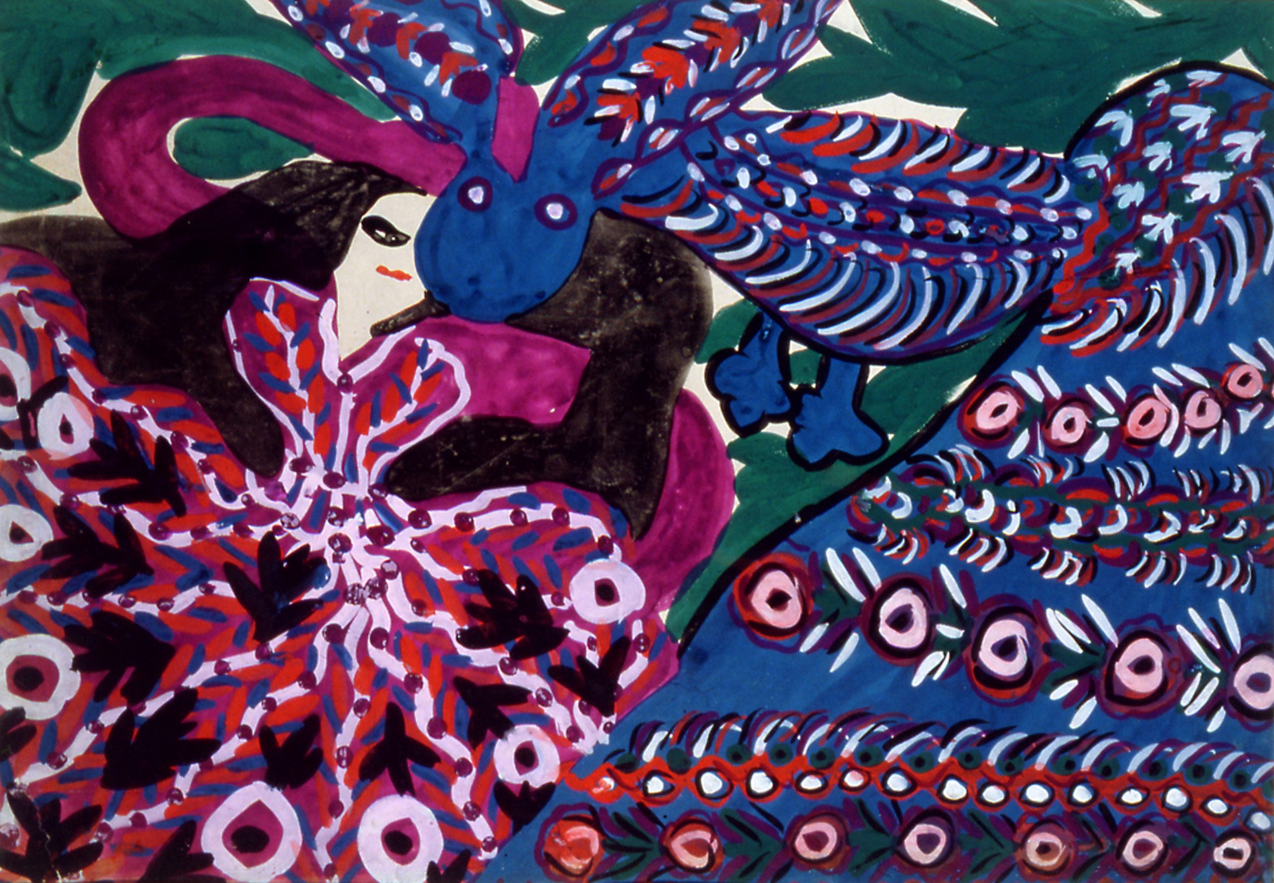 À Saint-Paul, la Fondation Maeght expose une éclatante suite d’œuvres de Baya, artiste algérienne, toutes datant de 1947, année de sa première exposition présentée en France dans la galerie Maeght (Paris). Une déflagration dans le monde de l’art, tant la sûreté tranquille de son tracé et l’harmonie évidente des couleurs s’imposaient au regard sans conteste possible. Elle n’avait alors que 16 ans et aucune formation artistique. Dans la préface du catalogue, André Breton avait écrit : « Le monde sera sauvé par les femmes et les enfants…«
