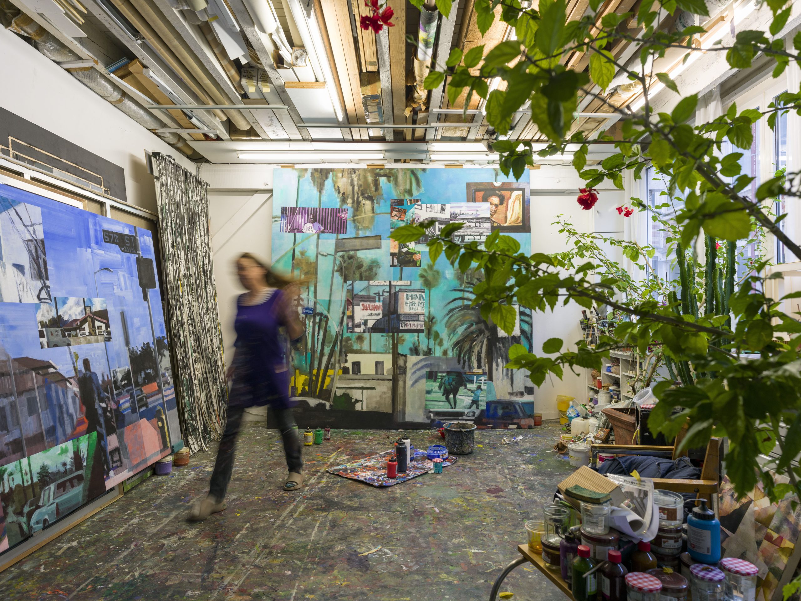 Le séjour américain de Carole Benzaken, entre 1997 et 2004, a profondément marqué son approche. À Los Angeles – ville dont la vue depuis La Malmaison lui rappelle aujourd’hui les palmiers et la lumière –, elle fait l’expérience d’un monde en flux continu : circulation urbaine, prolifération d’images, rythmes syncopés du jazz. Les vidéos réalisées depuis une voiture en mouvement traduisent cette tension permanente. Transposées en peinture ou en dessin, ces visions fugitives cherchent à saisir l’instant au moment même où il échappe, faisant de la perte de lisibilité une nouvelle modalité d’apparition du sens.